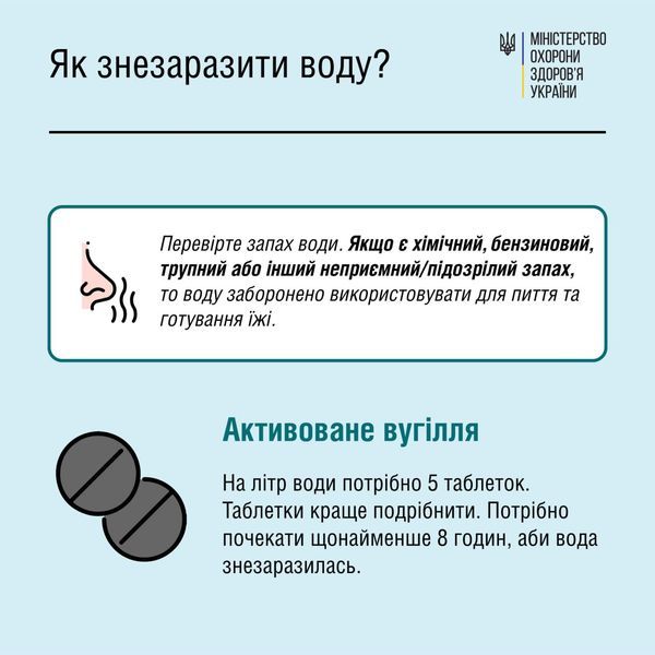 Перевірте запах води. Якщо є хімічний, бензиновий, трупний або інший неприємний/підозрілий запах, то воду заборонено використовувати для пиття та готування їжі.