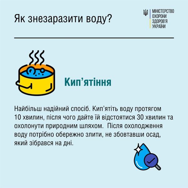 Пийте тільки кип’ячену або продезінфіковану питну воду.