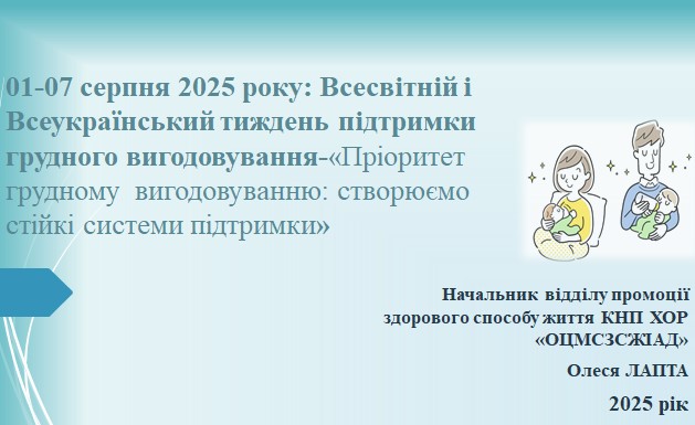 У рамках Всесвітнього тижня підтримки грудного вигодовування (1–7 серпня), який цього року пройшов під гаслом «Пріоритет грудному вигодовуванню: створюємо стійкі системи підтримки», фахівці Харківського обласного центру контролю та профілактики хвороб МОЗ України підготували тематичну презентацію.