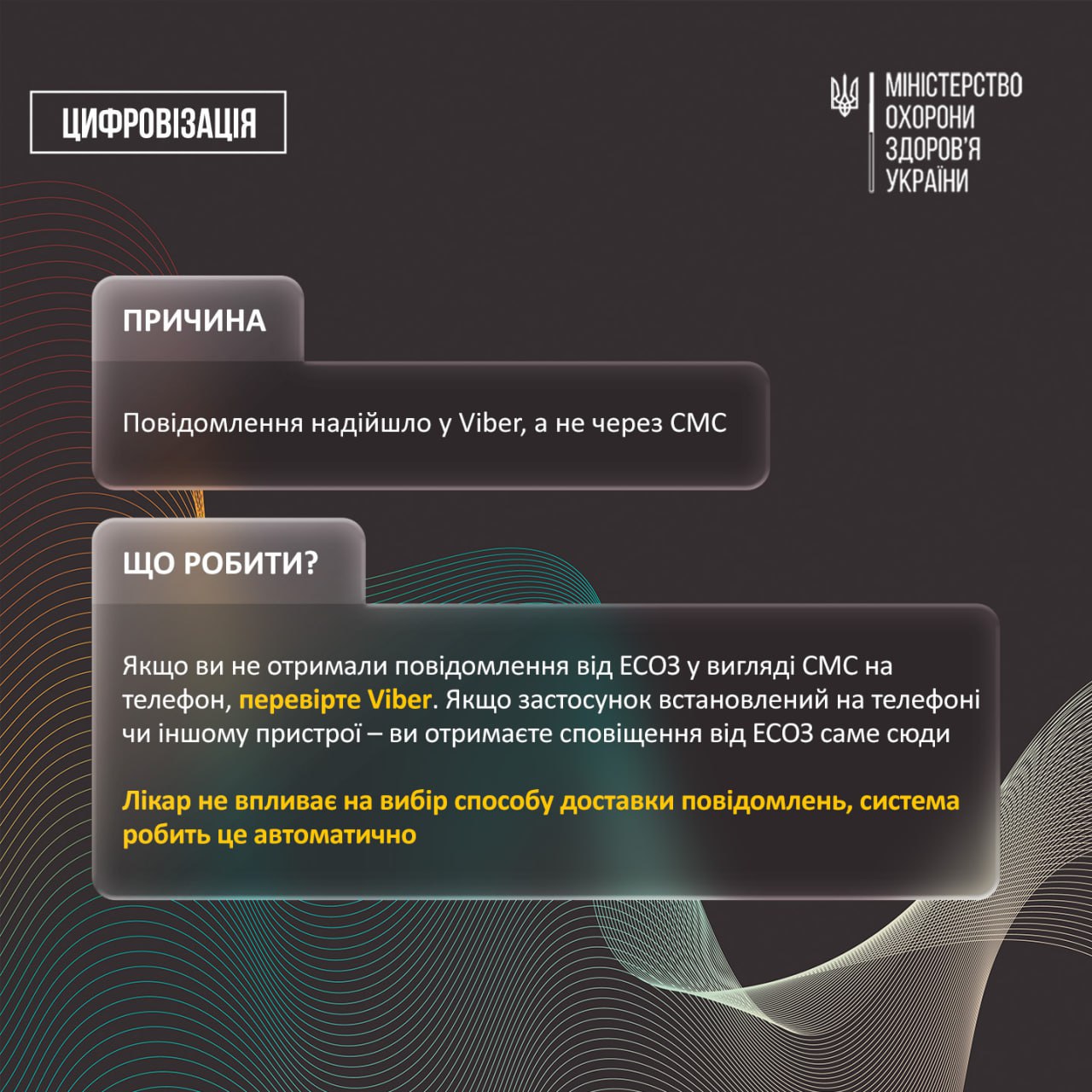 Повідомлення від електронної системи охорони здоров’я (ЕСОЗ) надходять пацієнту на номер телефона, за яким він у ній зареєстрований. Це відбувається через СМС або за наявності – Viber. Однак інколи трапляється так, що повідомлення не надходять.