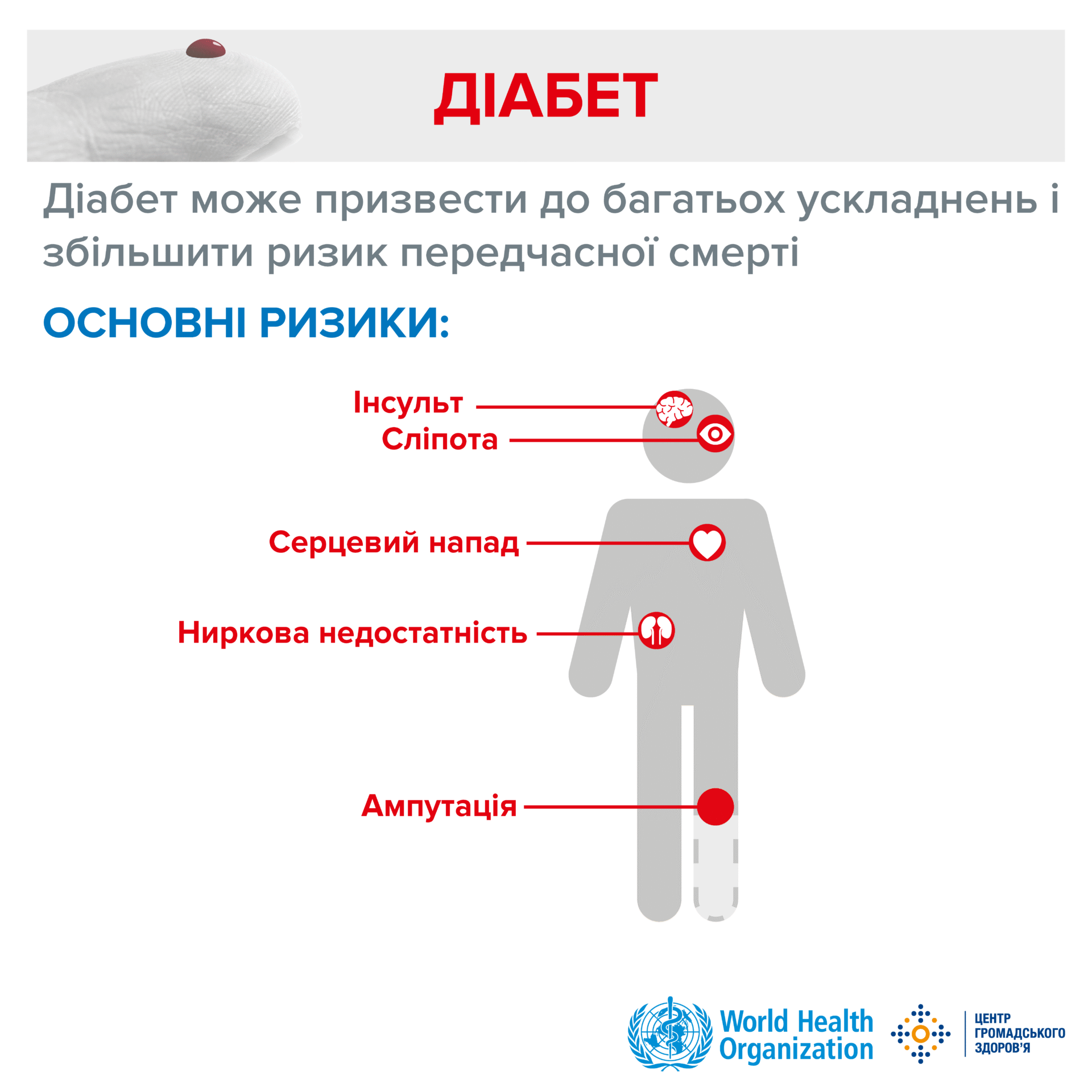 - У дорослих людей з діабетом ризик розвитку інфаркту та інсульту в 2-3 рази вище.