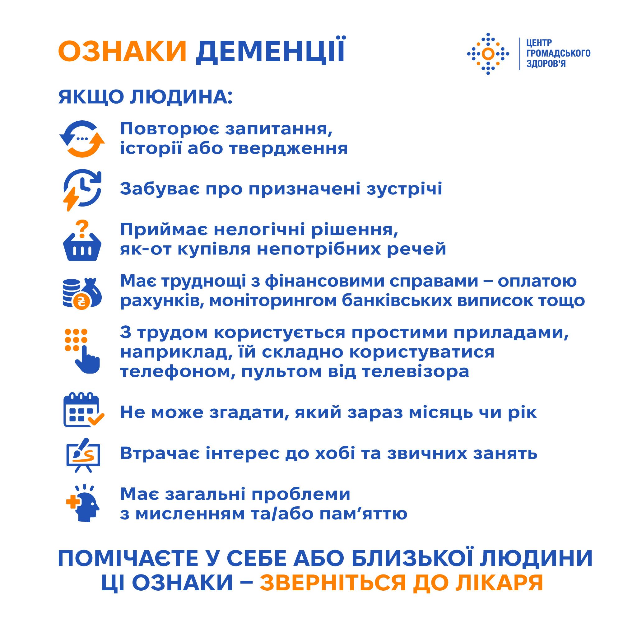 Деменція — це порушення роботи мозку, яке спричиняє погіршення пам’яті, мислення, орієнтації, мови та здатності робити звичні повсякденні речі. Це аж ніяк не частина «нормального старіння».