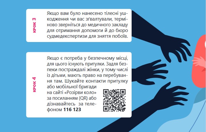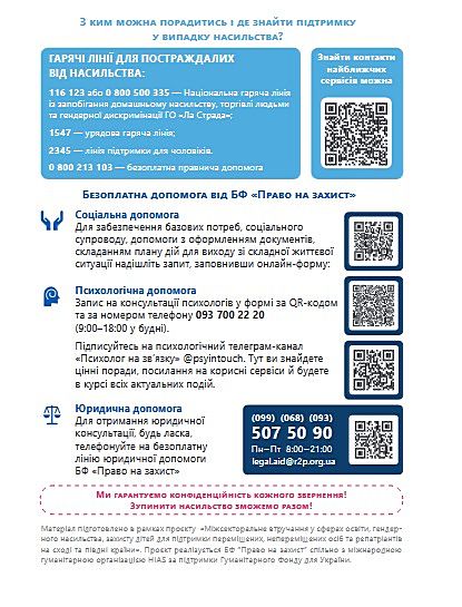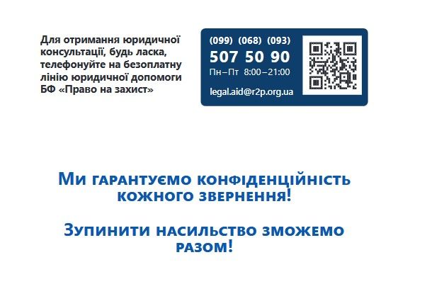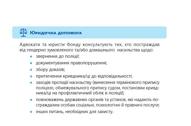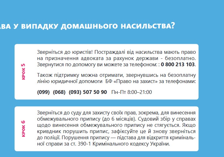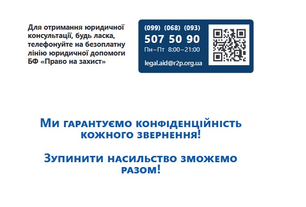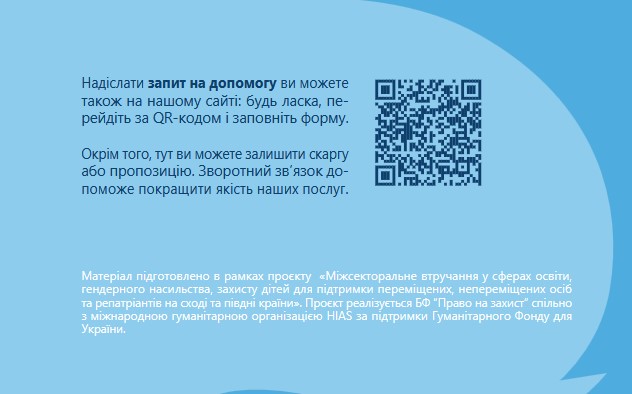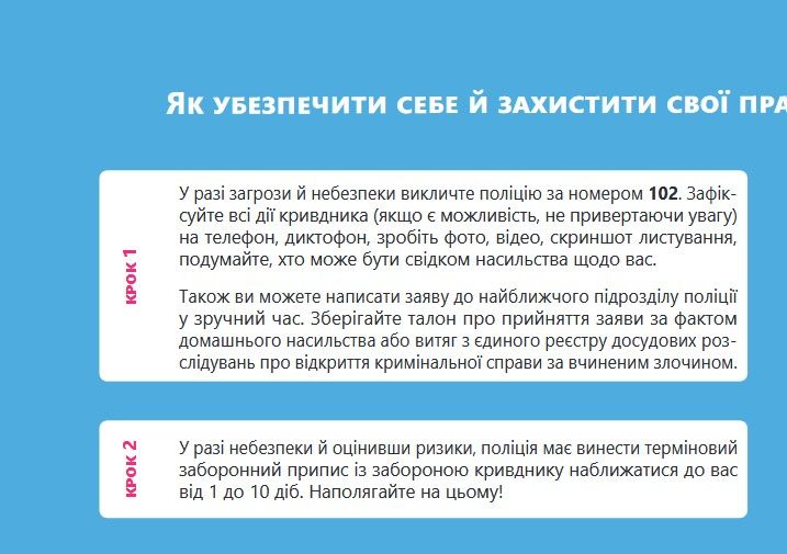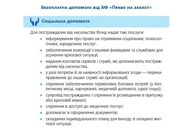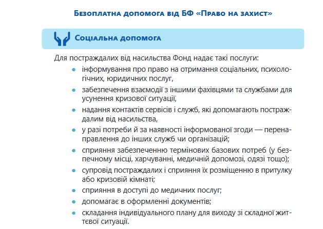 Про те як убезпечити й захистити себе від домашнього насильства йдеться в матеріалах брошури, яка надається увазі користувачів сайту. Також тут йдеться про безоплатну допомогу від БФ «Право на захист» – провідної в Україні правозахисної організації, яка надає багатоцільову допомогу ВПО, постраждалим від воєнних вій, біженцям, шукачам захисту та особам без громадянства.
