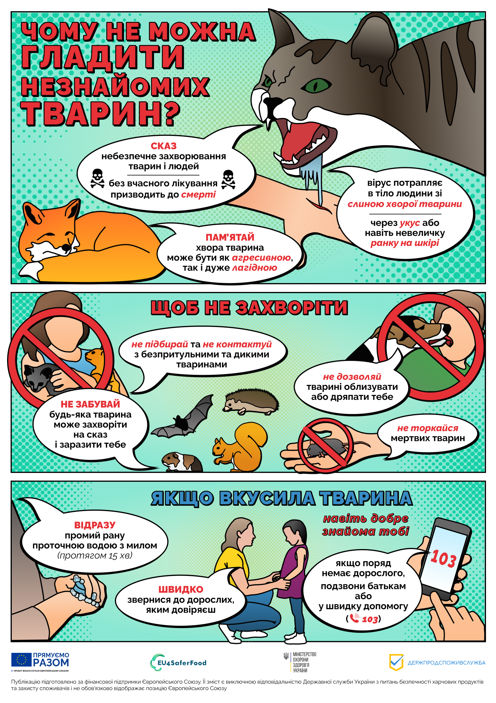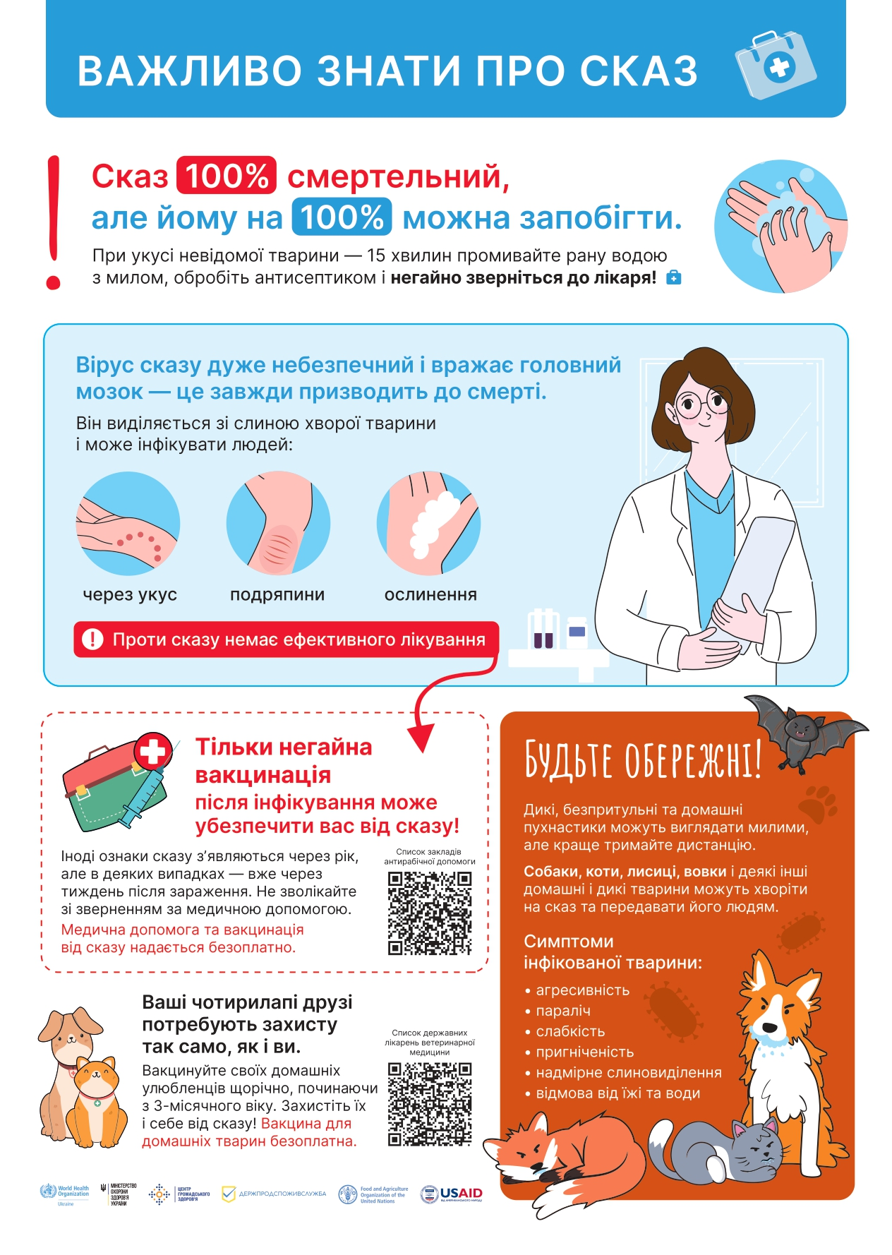 • якщо поведінка вашої або чужої тварини викликає підозру — наприклад, з’являється агресія, страх води чи світла, — негайно повідомте ветеринарну службу.