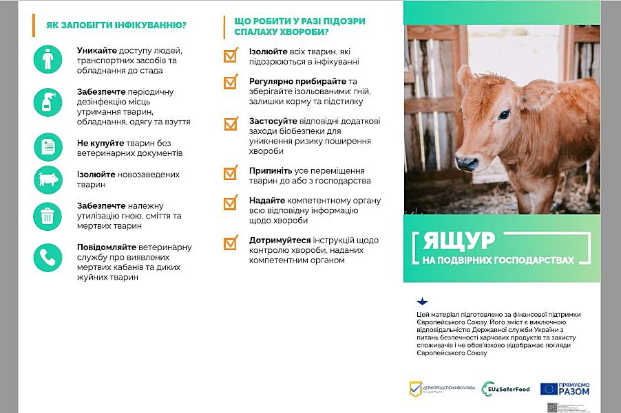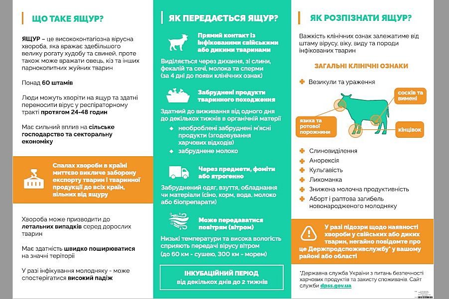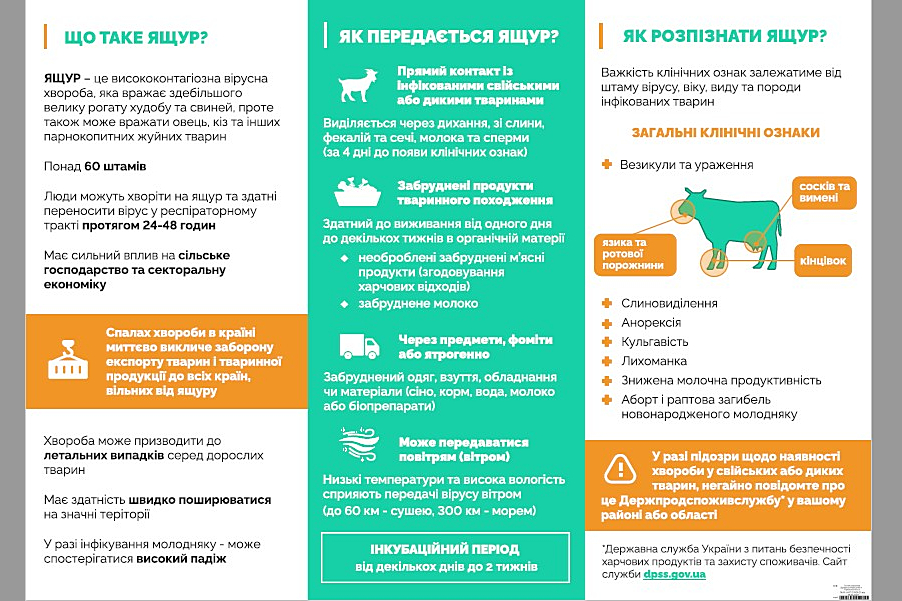 У зв’язку з реєстрацією випадків ящуру на території Європейського Союзу та з метою підвищення рівня обізнаності громадськості щодо небезпеки занесення вірусу ящуру на територію України, зокрема характерних клінічних ознак хвороби та основні заходи профілактики доводимо до відома користувачів сайту інформаційні матеріали Держпродспоживслужби України.