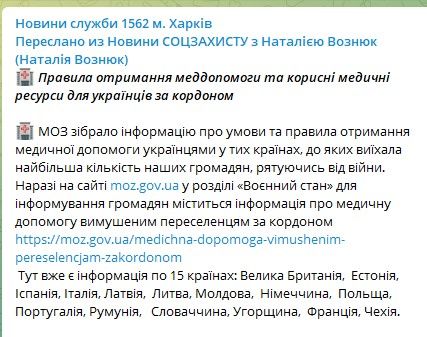 МОЗ зібрало інформацію про умови та правила отримання медичної допомоги українцями у тих країнах, до яких виїхала найбільша кількість наших громадян, рятуючись від війни. Наразі на сайті moz.gov.ua у розділі «Воєнний стан» для інформування громадян міститься інформація про медичну допомогу вимушеним переселенцям за кордоном https://moz.gov.ua/medichna-dopomoga-vimushenim-pereselencjam-zakordonom