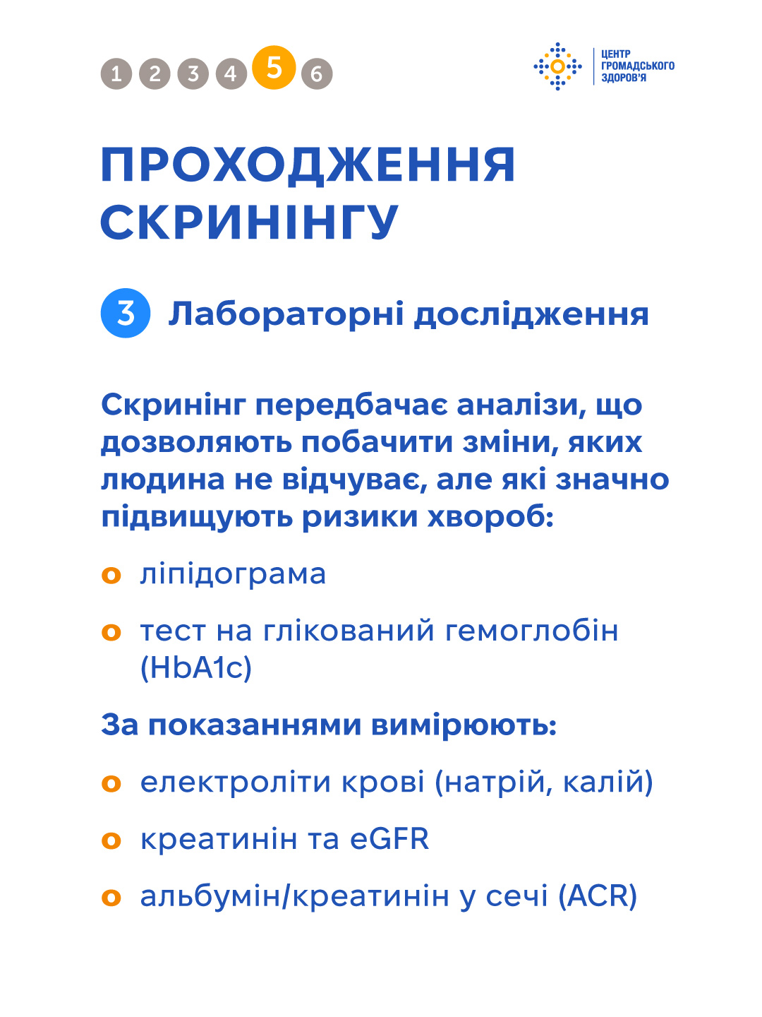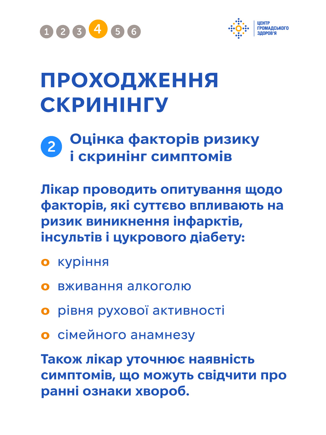 Скринінг — це обстеження, тести та інші процедури для виявлення хвороб або факторів ризику в людей без симптомів. Це простий і безпечний спосіб завчасно виявити хвороби, які можуть непомітно розвиватися й проявитися пізніше вже у вигляді ускладнень. А 40+ — це вік, коли різко зростає ризик розвитку серцево-судинних хвороб і діабету.
