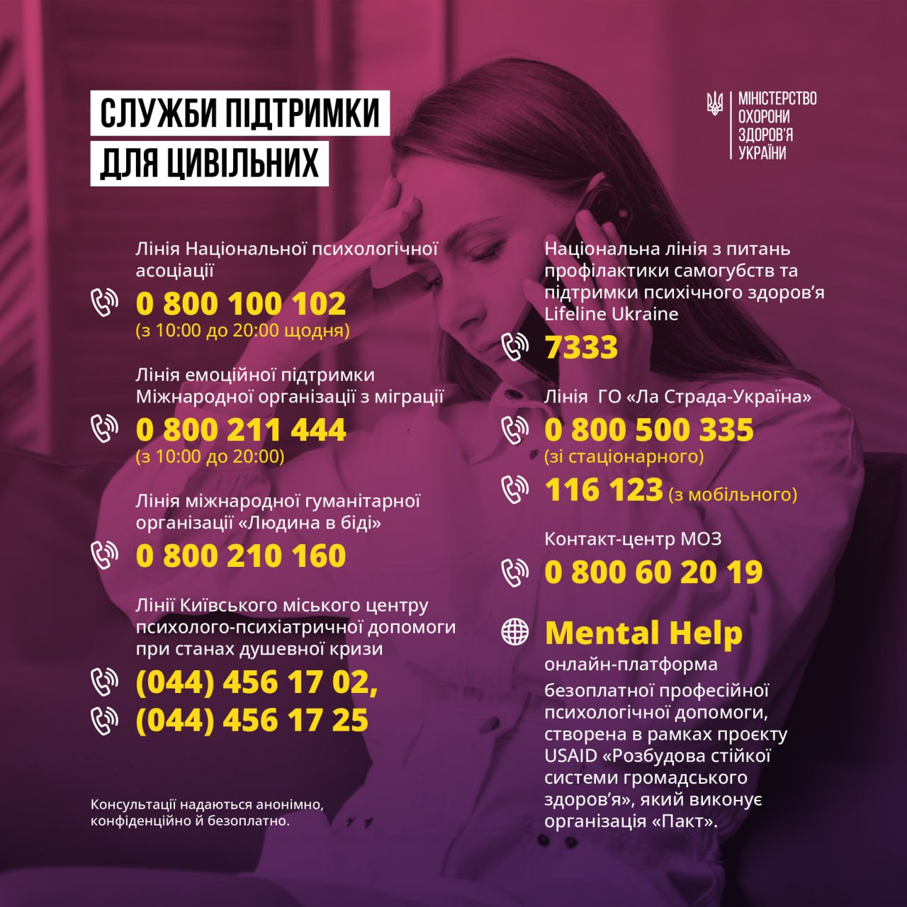 Потребуєте психологічної підтримки, але не можете чи не хочете йти до лікаря — зверніться на одну з гарячих ліній чи до служби підтримки.