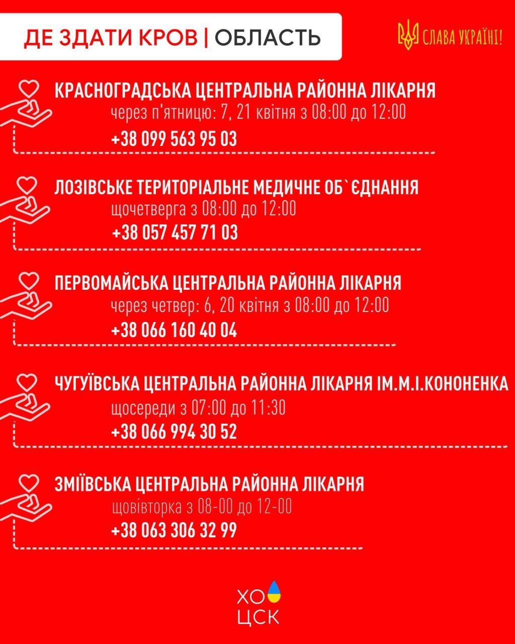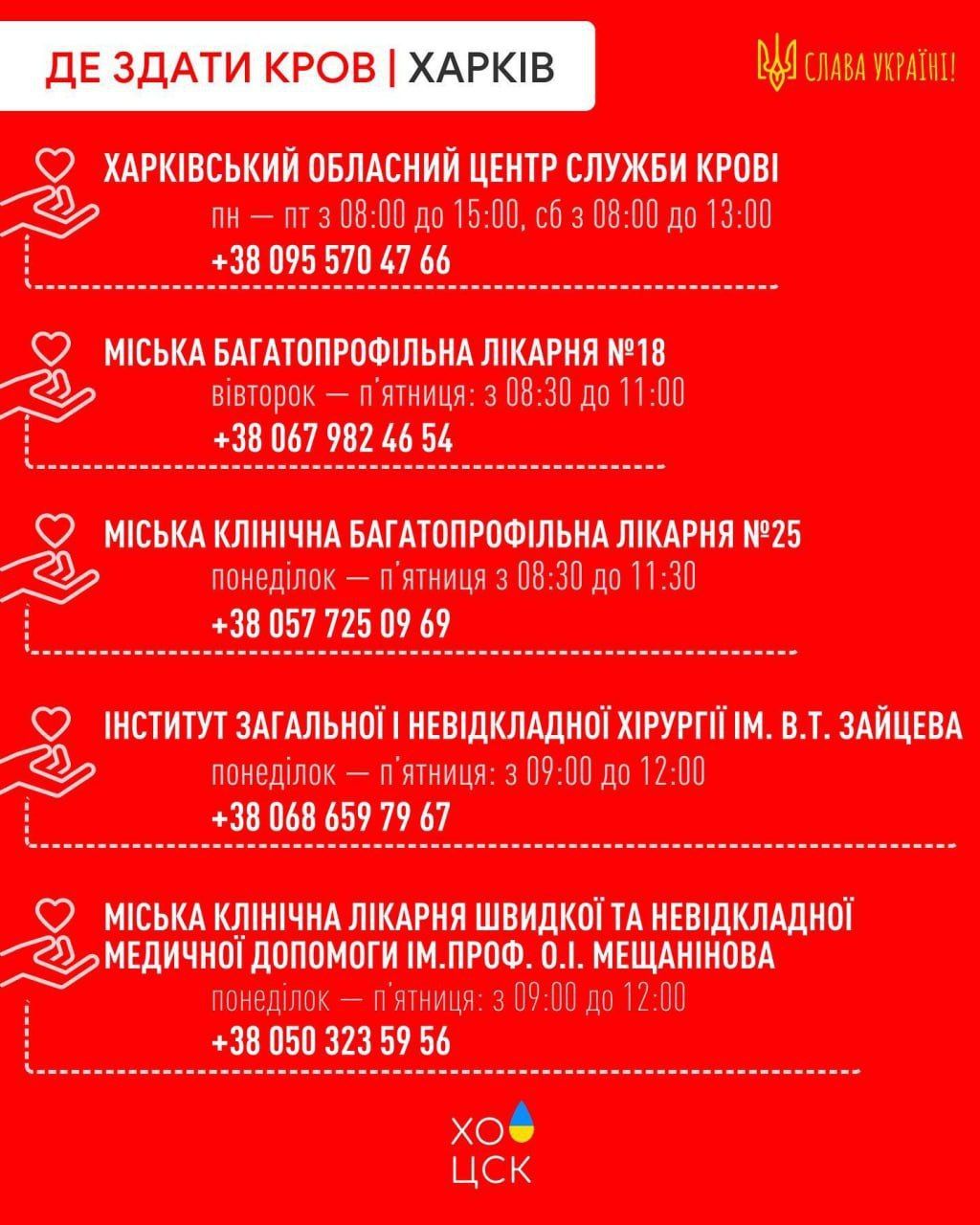 Центр крові у Харкові знаходиться на вулиці Клочківській, 366 (телефон +38 095 570 47 66).