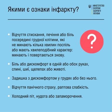 У разі, якщо ви підозрюєте у себе інфаркт, негайно зверніться по медичну допомогу. Про те, як отримати допомогу в разі інфаркту під час воєнного стану, читайте у нашій публікації.