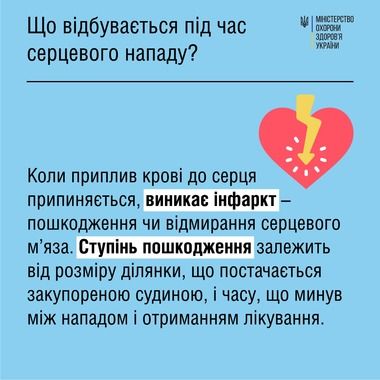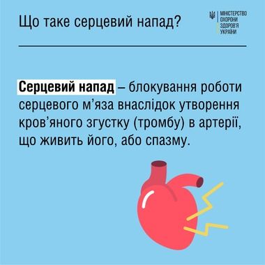 Серцевий напад (або інфаркт) – блокування роботи серцевого м’яза внаслідок утворення кров’яного згустку (тромбу) в артерії, що живить його, або спазму. Коли приплив крові до серця припиняється, виникає інфаркт. Ділянка серцевого м’яза, що живиться цією артерією, починає відмирати. Ступінь пошкодження серцевого м’яза залежить від розміру ділянки, що постачається закупореною судиною, і часу, що минув між серцевим нападом і отриманням лікування.