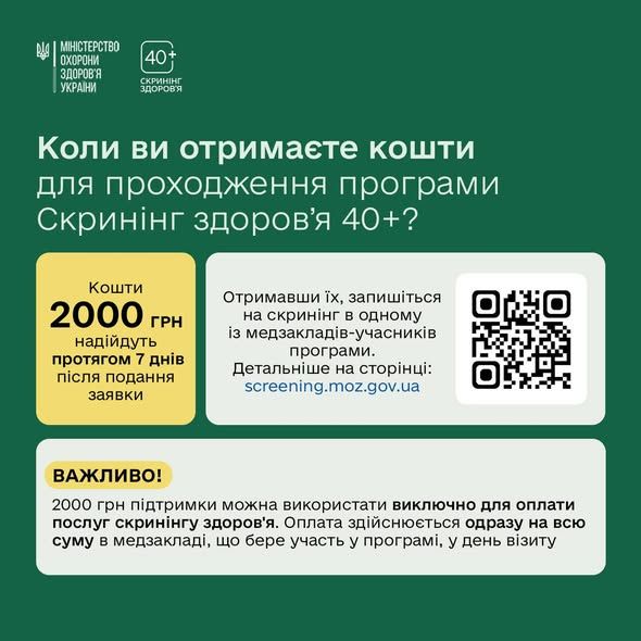 «Скринінг здоров’я 40+» — національна програма для українців та українок віком від 40 років. Вона передбачає базові обстеження для раннього виявлення захворювань і щорічну перевірку серця, рівня цукру та ментального здоров’я. Після подання заявки держава надає 2000 гривень на обстежень.