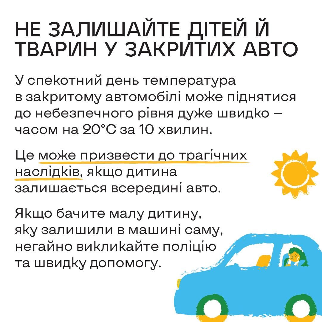 Температура у закритому просторі може піднятися набагато вище, тому ніколи не залишайте дітей або домашніх тварин у закритих автомобілях! Слідкуйте за попередженнями про спеку у вашому регіоні та дотримуйтесь рекомендацій лише з перевірених джерел.