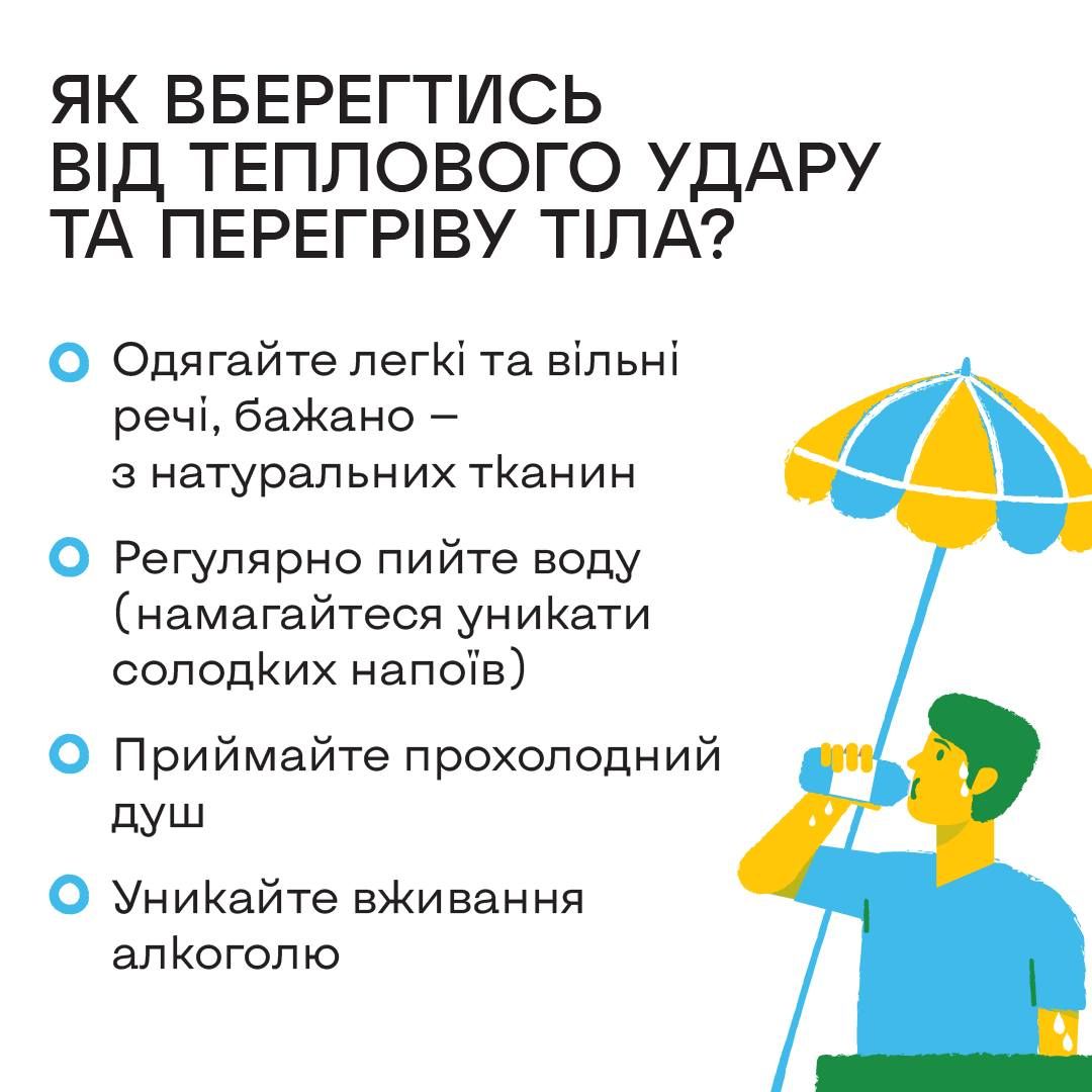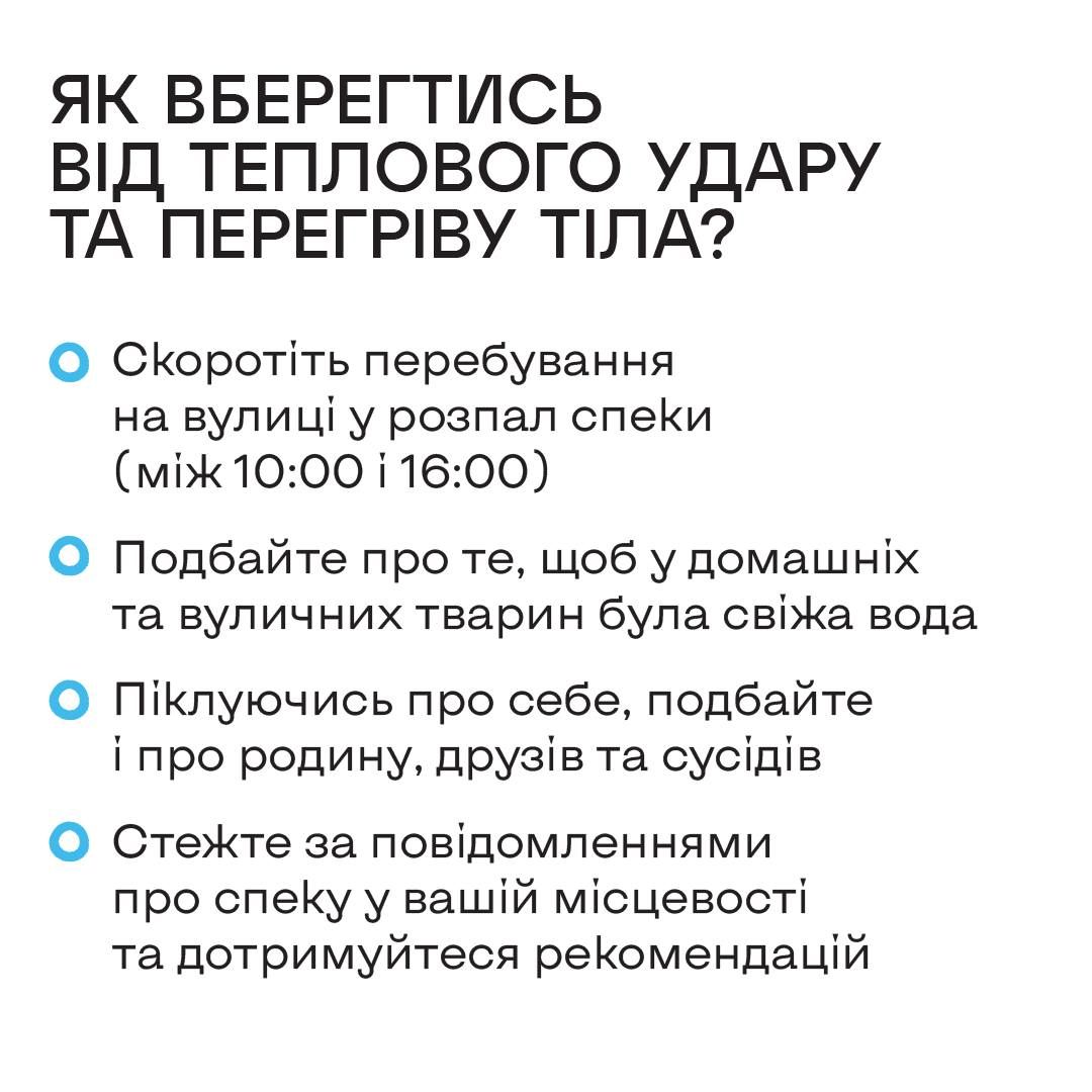 Щоб захистити себе та своїх близьких від спеки та пов’язаних з нею наслідків для здоров’я, ось кілька простих порад як упоратися з сильною спекою: пийте більше чистої води, щоб уникнути зневоднення; носіть легкий одяг; по можливості залишайтеся в тіні; не готуйте і не вживайте зіпсовану їжу (це може спричинити розлад шлунково-кишкового тракту).