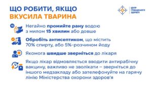 Якнайшвидше отримайте антирабічну постконтактну профілактику — бажано протягом 24 годин після укусу. Чим пізніше це зробити, тим вищий ризик інфікування сказом.