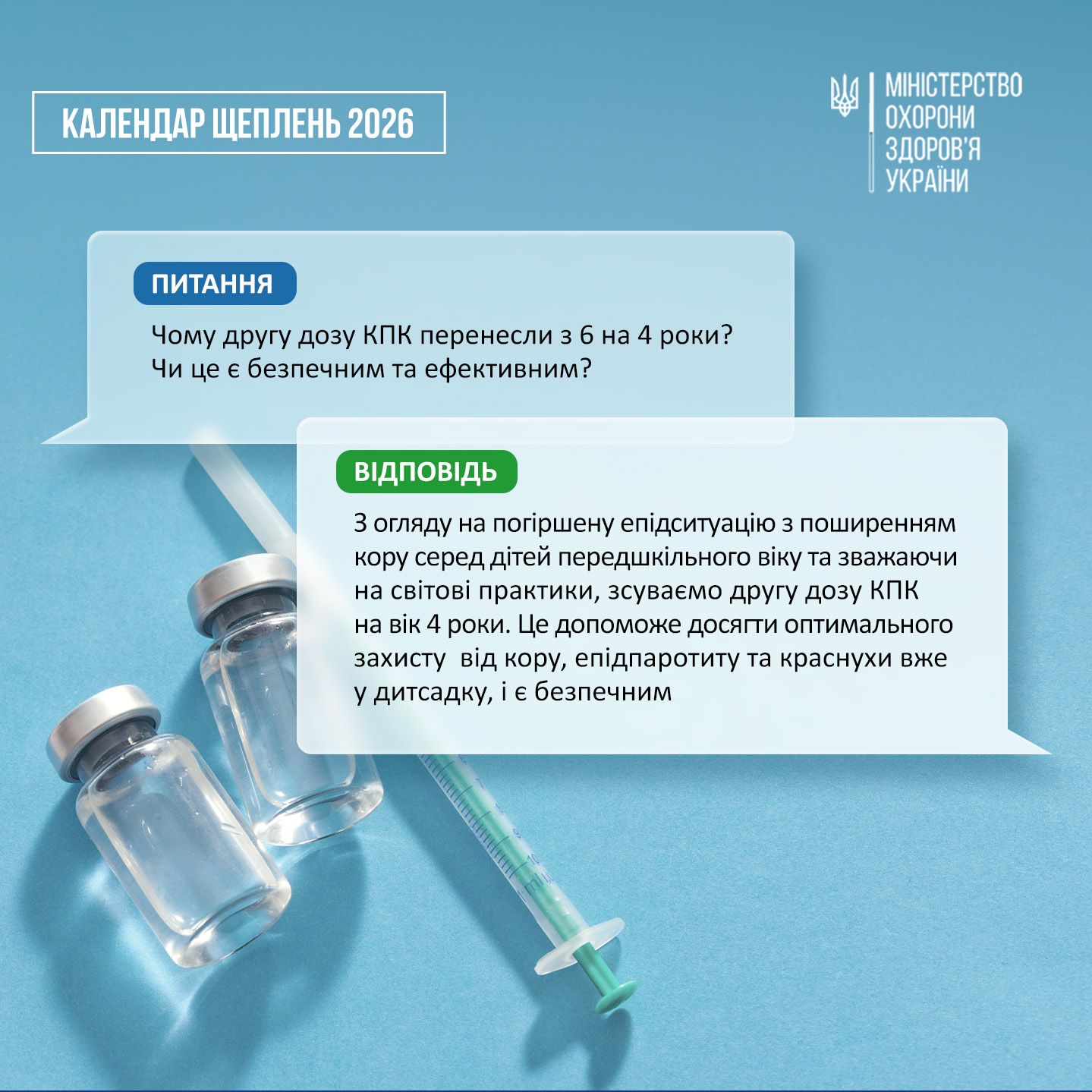В частині країн ЄС та в багатьох інших країнах світу друга доза КПК вводиться раніше віку 6 років. З огляду на ситуацію з поширенням кору серед дітей передшкільного віку зсуваємо другу дозу КПК на вік 4 роки, аби досягти оптимального захисту від кору, епідпаротиту та краснухи вже у дитсадку. Станом на вересень 2025 року кількість випадків кору в Україні становила 1146 випадків.